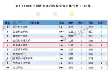 4月23日,“金平果”第十七次《中国大学及学科专业评价报告(2020-2021)》出炉,南昌理工学院被评为全国理工类院校排名第180名,全国民办高校排名前5强。 [详细]