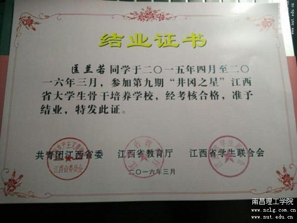 据悉,第九期“井冈之星”江西省大学生骨干培养学校由省教育厅、团省委、省学联联合举办,通过选拔共有来自全省69所高校226名学生入选,其中198名学员顺利结业,淘汰28名(我校无一人淘汰)。近年来校团委根据《大学生骨干培养工作实施细则》的要求,进一步加强和规范校级大学生骨干培训班,完善课程设置、内部管理和跟踪培养,取得了较好的效果。