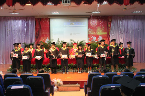 伴着激昂的音乐声,在主席台就坐的领导为2012届本科毕业生(代表)颁发了毕业证书及学位证书。