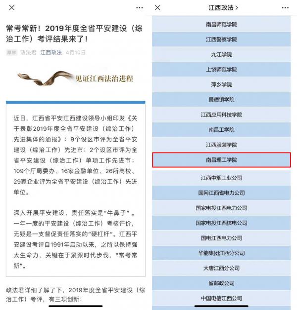 南理网讯(通讯员 刘波波)近日,江西省平安江西建设领导小组印发《关于表彰2019年度全省平安建设(综治工作)先进集体的通报》,南昌理工学院荣获2019年度全省平安建设(综治工作)先进单位荣誉称号。