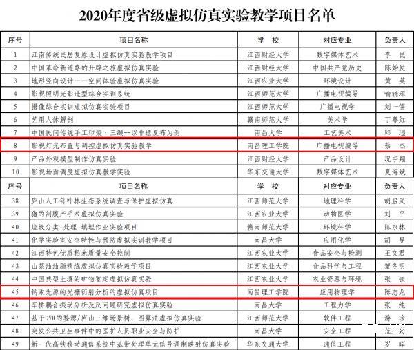 南理网讯(通讯员:郑勇军)近日,江西省教育厅下发了《关于公布2020年度省级虚拟仿真实验教学项目认定结果的通知》(赣教高字〔2020〕30 号),南昌理工学院电子与信息学院陈志龙副校长负责的《钠汞光源的光栅衍射分析的虚拟仿真项目》和传媒学院蔡杰老师负责的《影视灯光布置与调控虚拟仿真实验教学》2个项目获得省级虚拟仿真实验教学项目认定。目前,我校已有省级高校示范性虚拟仿真实验教学项目3项,这是我校本科教学改革的重要成果。
