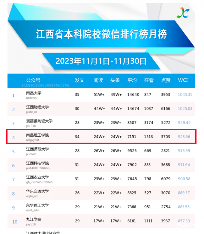 全省本科高校第四!民办第一!11月江西省本科院校微信排行榜