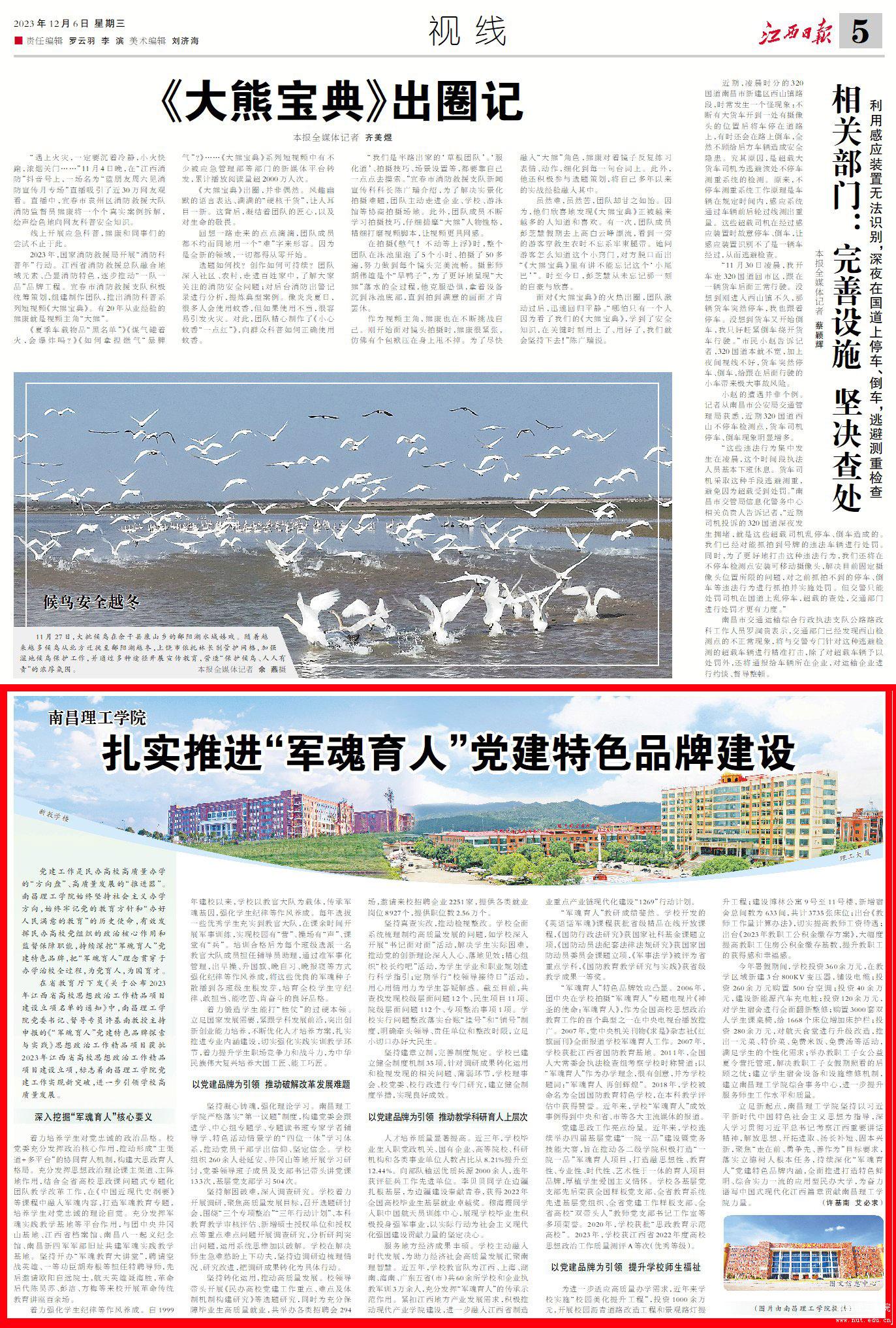 2023年12月6日,《江西日报》第5版以“南昌理工学院:扎实推进“军魂育人”党建特色品牌建设”为题,报道南昌理工学院始终坚持社会主义办学方向,始终牢记党的教育方针和“办好人民满意的教育”的历史使命,有效发挥民办高校党组织的政治核心作用和监督保障职能,持续深挖“军魂育人”党建特色品牌,把“军魂育人”理念贯穿于办学治校全过程,为党育人,为国育才。