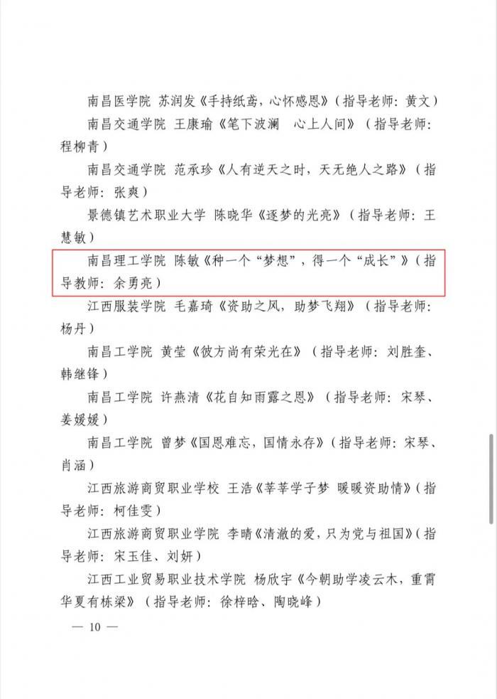 近日,江西省教育厅公布了第四届“筑梦飞翔·资助伴我成长”主题征文活动获奖结果的通知。南昌理工学院再创佳绩,取得新的突破,荣获全省主题征文优秀组织奖;邱佳诺同学的作品《生在红旗下 长在春风里》(指导老师:刘姝)荣获一等奖;陈敏同学的作品《做一个“梦” 得一个“成长”》(指导老师:余勇亮)荣获三等奖;教师组建筑工程学院高阿红老师的《好风凭借力 送我步青云》荣获二等奖。