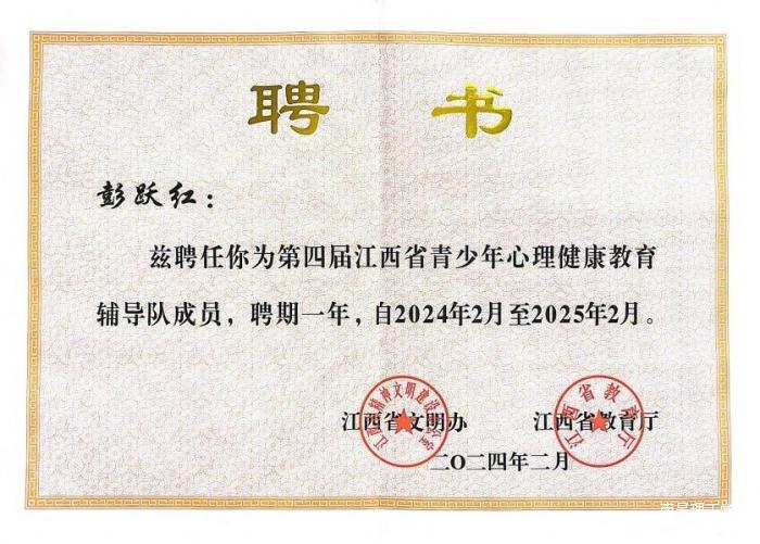 为进一步加强和改进新时代青少年心理健康工作,提升青少年心理健康素养,省文明办、省教育厅、省卫生健康委、省关工委共同开展第四届江西省“百场辅导进百校”(两百场辅导进两百所学校)心理健康教育志愿实践活动。经学校积极报名申请,百场辅导进百校活动组委会办公室审核教师资质,我校心理咨询中心主任彭跃红教授入选第四届江西省“百场辅导进百校”辅导队成员。