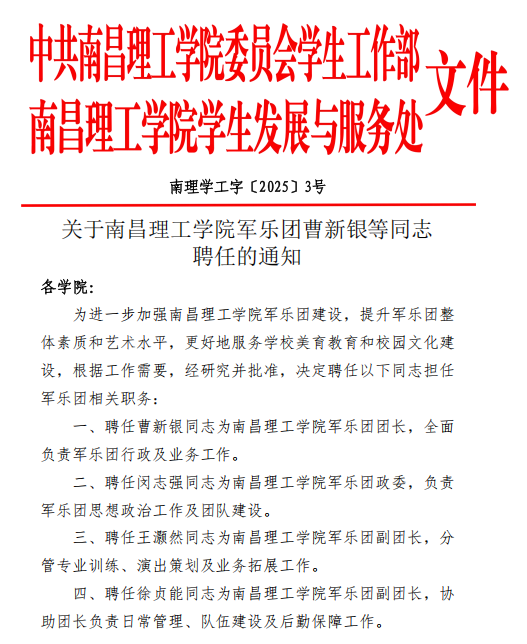 校长助理、学工部(学生处)部长张友文宣读了校军乐团人员聘任通知,希望校军乐团为此次大会为新起点,坚持立正创新、继承光荣传统、强化自身建设,着力推动军乐团各项事业再上新台阶,在引领校风学风、繁荣校园文化、开展素质教育等方面作出更大的贡献。