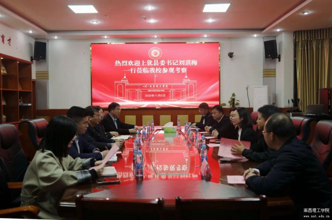 为深化校地双方的交流合作,2025年11月5日,上犹县委书记刘洪梅,县委常委、县政府常务副县长陈安旖,县委常委、组织部部长罗少贵,县委办主任王作文、县发改委主任刘发彬、县教科体局局长余旺生一行莅临我校参观考察交流。学校在理工大厦三楼会议室举行了座谈会,学校党委书记、督导专员万年辉出席会议并讲话,学科建设与发展规划处处长王水平、党委宣传部常务副部长刘少宽、党委学工部副部长方婷、校团委书记陈磊、校团委副书记赖舒云参加会议,座谈会由校党委书记、督导专员万年辉主持。