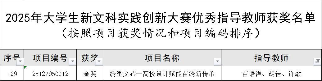 在11月29日至30日的决赛中,我校学子凭借扎实的研究基础、清晰的逻辑表达和突出的实践应用价值,赢得了评委的一致认可。其中,《绣里文芯一高校设计赋能苗绣新传承》 项目脱颖而出,荣获大赛金奖。