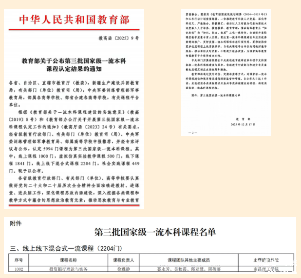 近日,教育部公布第三批国家级一流本科课程认定结果(教高函〔2025〕9 号)。我校经济管理学院徐雅静教师团队倾力打造的《投资银行理论与实务》课程,凭借鲜明的混合式教学特色与优异的建设成效,成功获评线上线下混合式国家级一流本科课程。充分体现了学校在深化教育教学改革、推进一流课程建设方面的显著成效,对提升学校人才培养质量具有重要里程碑意义。