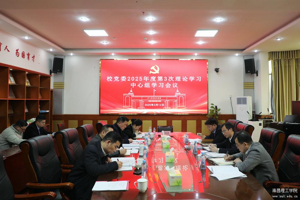 2025年3月12日上午,南昌理工学院在理工大厦三楼会议室召开2025年度第3次校党委理论学习中心组学习会。校党委书记、督导专员万年辉主持会议并讲话;校党委副书记、校长范彦斌,校党委副书记、纪委书记丁良喜出席会议;全体在校党委委员参加会议。
