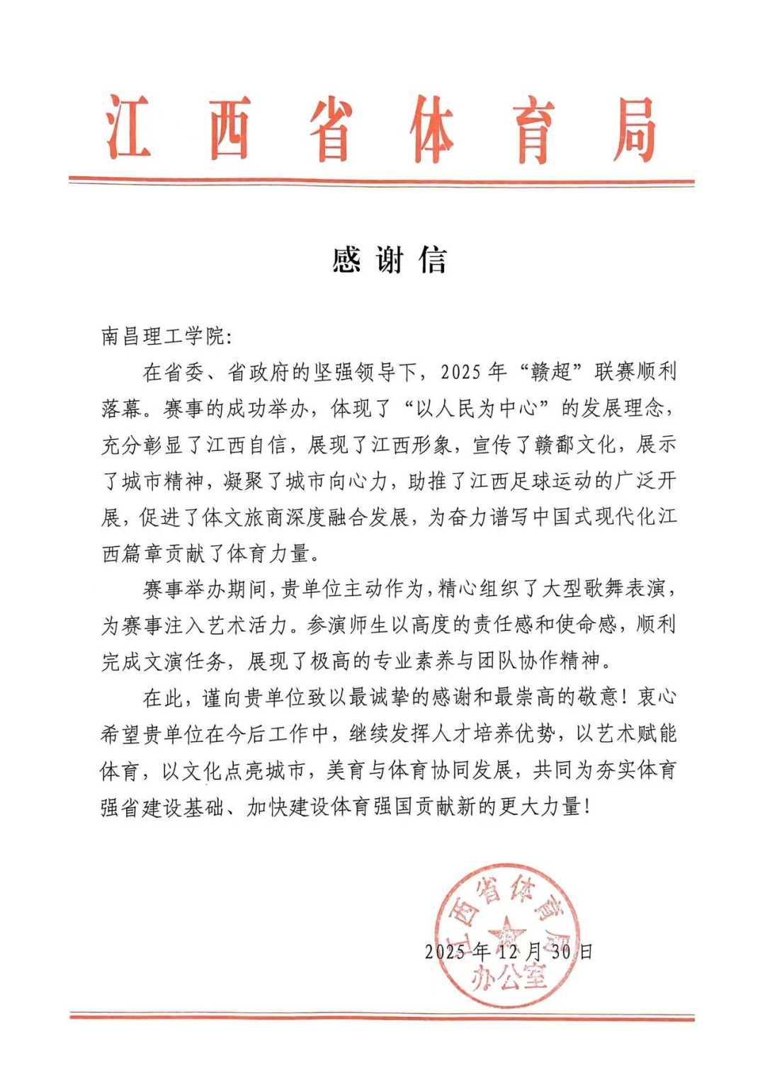 近日,江西省体育局向南昌理工学院发来感谢信,对我校音乐与舞蹈学院在2025年“赣超”联赛中的卓越表现予以高度赞誉,向学校致以最诚挚的感谢和最崇高的敬意!这份来自省级权威部门的感谢信,既是对音乐与舞蹈学院过往成绩的肯定,更是未来发展的全新起点。音乐与舞蹈学院将以此为契机,进一步深化“文体融合”的探索实践,持续提升专业影响力与社会服务能力。