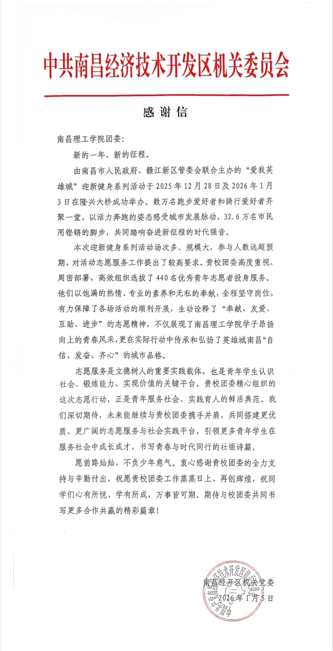 由南昌市人民政府、赣江新区管委会联合主办的“爱我英雄城”迎新健身系列活动于2025年12月28日及2026年1月3日在隆兴大桥成功举办。数万名跑步爱好者和骑行爱好者齐聚一堂,以活力奔跑的姿态感受城市发展脉动,32.6万名市民用铿锵的脚步,共同踏响奋进新征程的时代强音。中共南昌经济技术开发区机关委员会送来感谢信,对南昌理工学院团委高度重视、周密部署、高效选拔了440名优秀青年志愿者投身志愿服务表示感谢。