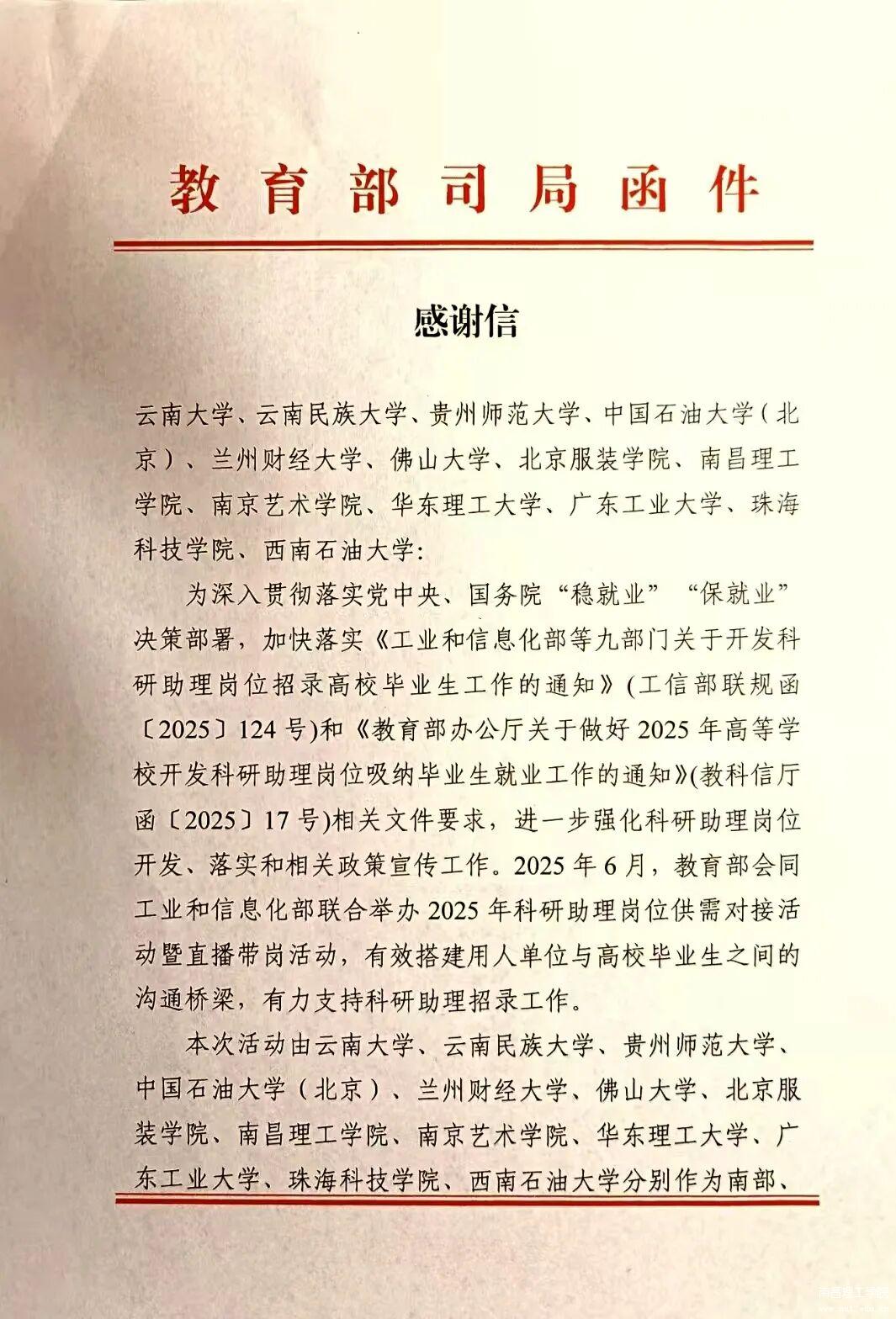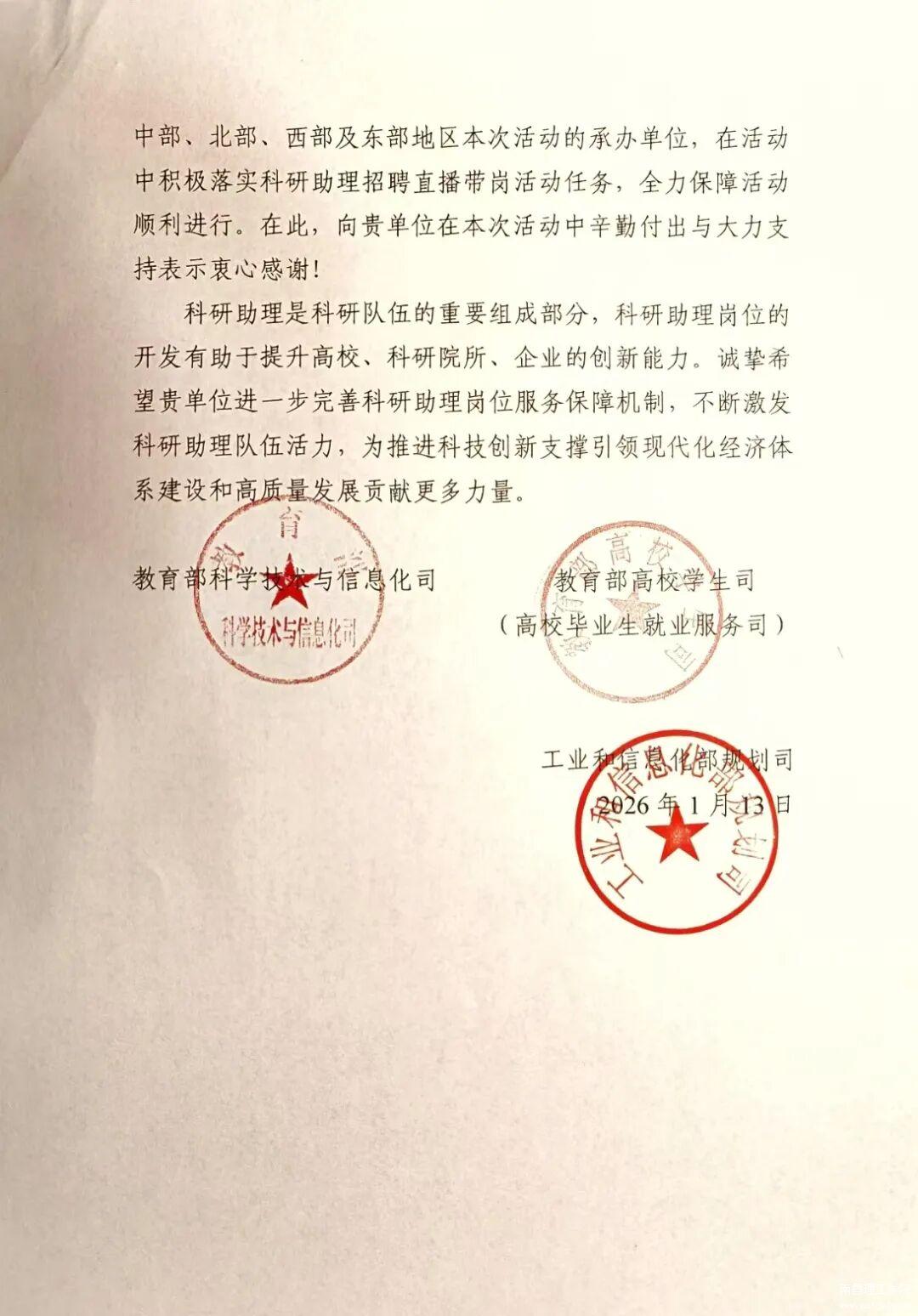 2026年1月13日,教育部科学技术与信息化司、教育部高校学生司、工业和信息化部规划司发来感谢信,向南昌理工学院在2025年科研助理岗位供需对接活动暨直播带岗活动中辛勤付出与大力支持表示衷心感谢!南昌理工学院作为中部地区活动的承办单位,在活动中积极落实科研助理招聘直播带岗活动任务,全力保障活动顺利进行。