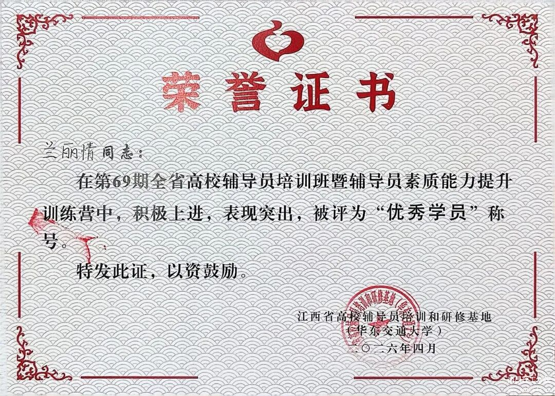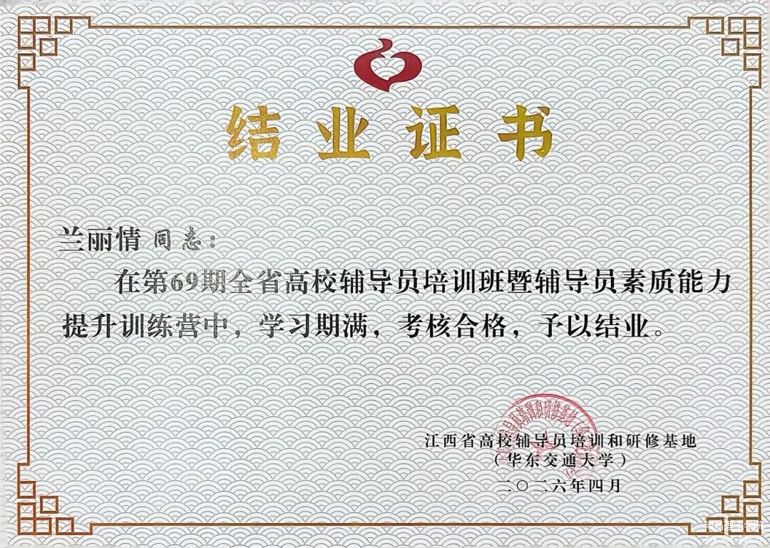2026年4月8日至10日,由省委教育工委、省教育厅主办的第69期全省高校辅导员素质能力提升培训班在华东交通大学举行。我校外国语学院辅导员兰丽情参训,并凭借出色表现获评“优秀学员”。